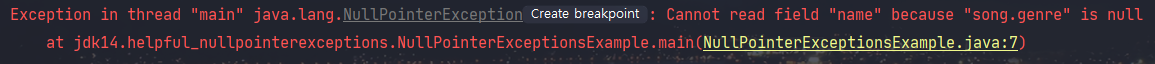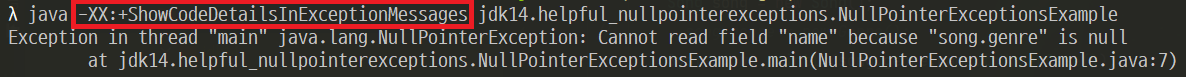 NullPointerException이 발생한 위치(라인 번호) 뿐만 아니라Cannot read field "name" because "song.genre" is null도 출력된다. - 이처럼 Java 14에 추가된 Helpful NullPointerExceptions를 사용하면 실제로