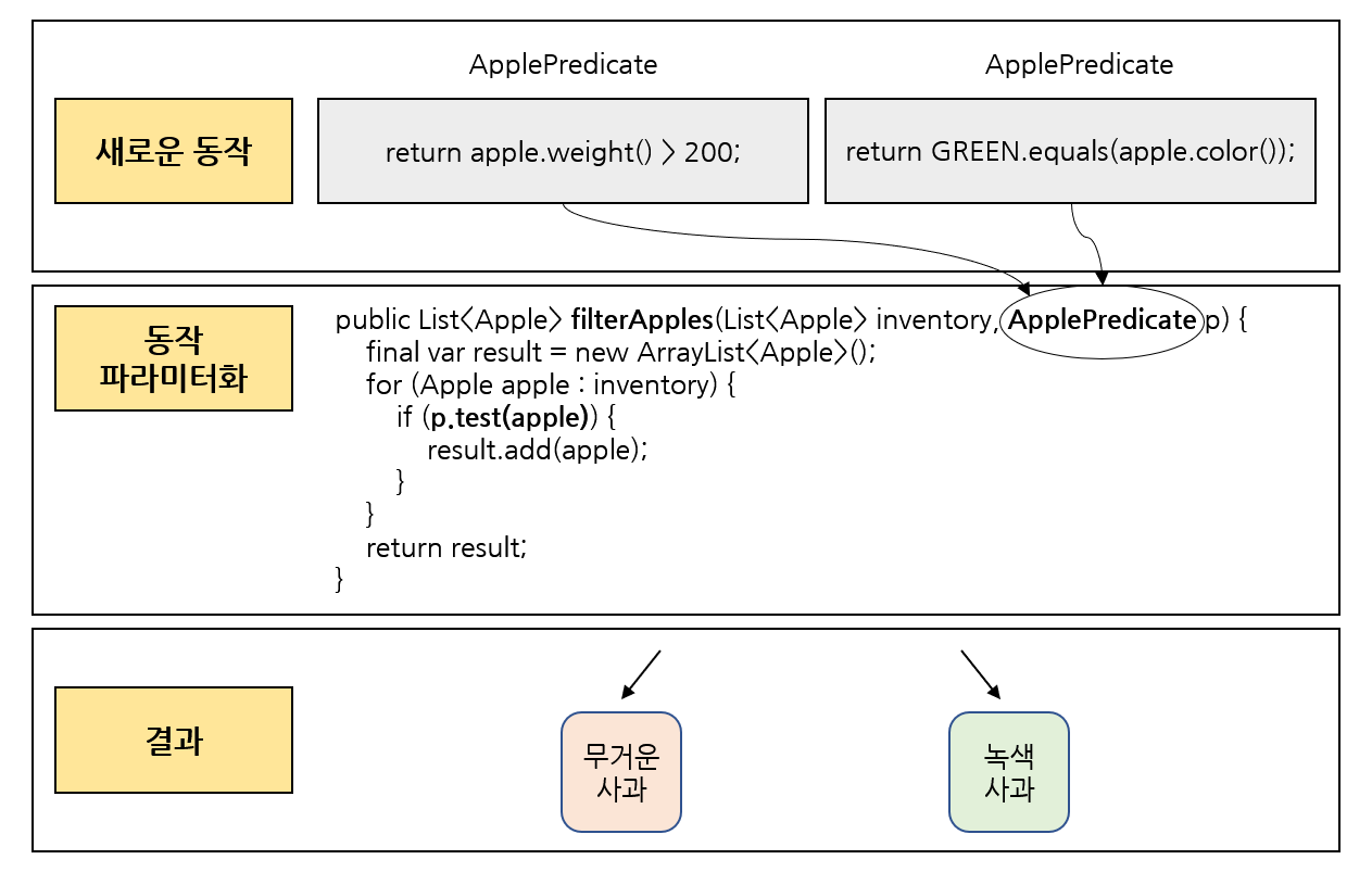public List<Apple> filterApples(List<Apple> inventory, ApplePredicate applePredicate) { final var result = new ArrayList<Apple>(); for (final var apple : inventory) { if (applePredicate.test(apple)) { result.add(apple); } } return result; }첫 번째 코드에 비해 더 유연한 코드를 얻었으며 동시에 가독성도 좋아졌을 뿐 아니라 사용하기도 쉬워졌다.