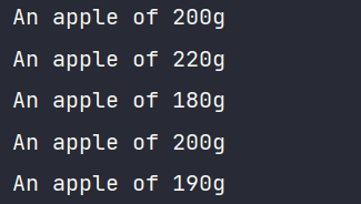 private final List<Apple> inventory = List.of( new Apple(Color.GREEN, 200), new Apple(Color.GREEN, 220), new Apple(Color.RED, 180), new Apple(Color.GREEN, 200), new Apple(Color.RED, 190));@Test @DisplayName("AppleFancyFormatter를 이용한 사과 출력") void prettyPrintAppleWithAppleFancyFormatter() { quizAnswer.prettyPrintApple(inventory, new AppleFancyFormatter()); }다음 코드를 실행한 결과다.
