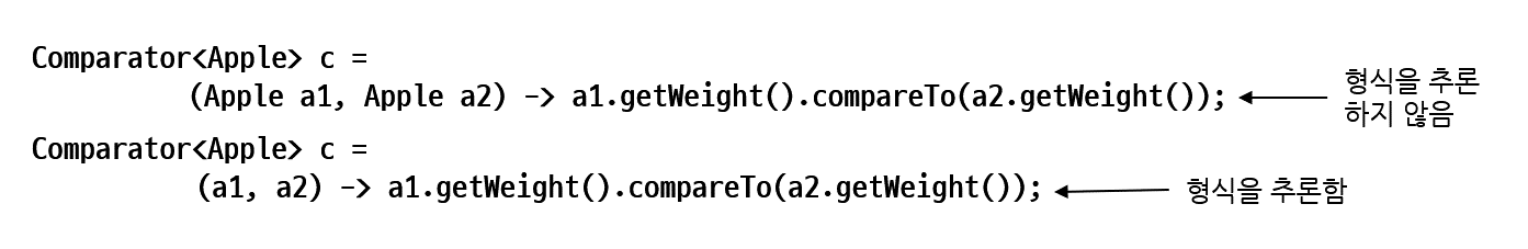 - 람다가 사용되는 컨텍스트(context)를 이용해서 람다의 형식(type)을 추론할 수 있다.